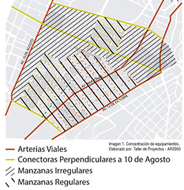 Consecuentemente, en las avenidas 10 de Agosto y 6 de Diciembre se marcan ejes perpendiculares hacia la Av. Amazonas, estas dos avenidas al no ser perpendiculares los ejes transversales que las atraviesan al llegar a la Av. Amazonas generan manzanas irregulares (triangulares).